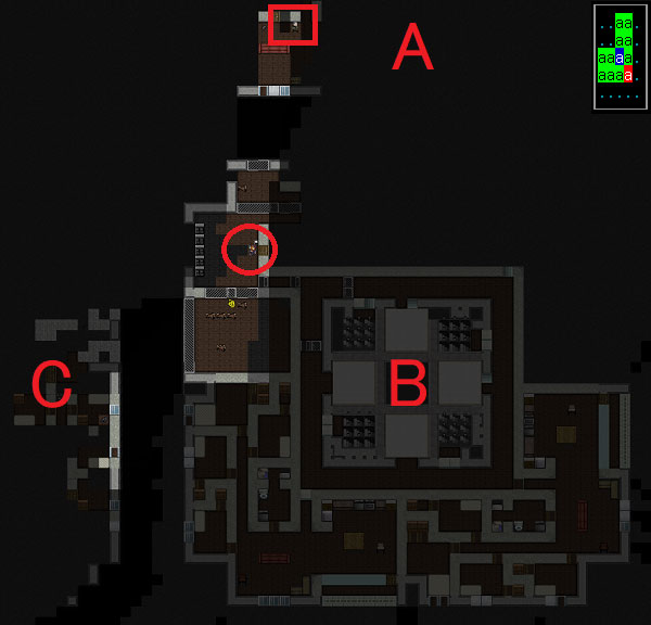 現在の全体マップは上の画像。戦闘の準備は完了しているのでサッサと5階に上がろうぜ。もしも5階が屋上ならば監禁されている捕虜に会えるはずだ。怪しい医者から聞いた情報が正しければだけどね。