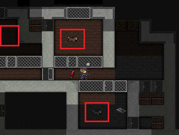 もう部屋の探索は充分に行った。最後に犬が何匹いるのか数えておきます。部屋の奥には3匹の犬がいるみたいね。大人しい犬なので金網を破壊したりはしません。