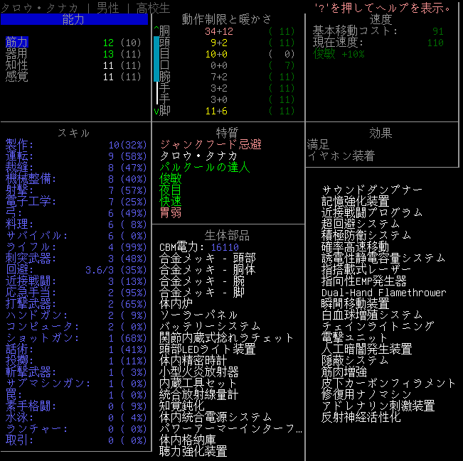 現在の能力値は上の画像。普段は表示しないCBMも画像に貼り付けておいたよ。タロウ・タナカは意外とCBMの数が多い。あまりにも多すぎて効果が不明なものばかりだ。
