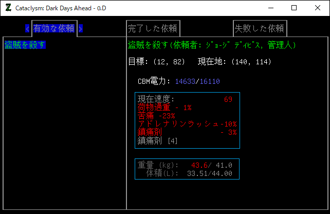 現在の有効な依頼は上の画像。盗賊クエストの達成条件を満たしたので、あとはジョージ・デイビスに報告するだけだ。それは良いのだけど苦痛の値があまりにも酷い。腕力の低下により所持品の重量がオーバーしています。