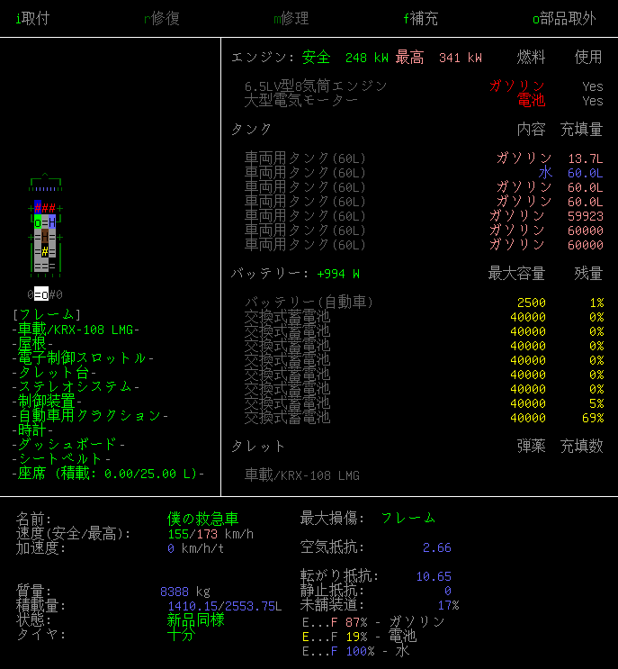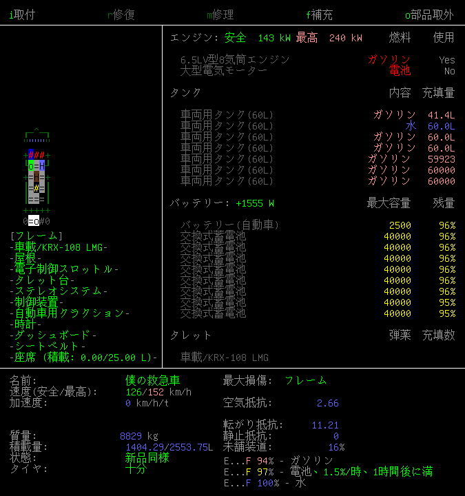 今回の投稿はここで終了します。現在の救急車は上の画像。何度か低木にぶつかったのにパーツが無傷だ。アパッチから回収した装甲板のおかげだなあ。バッテリーが減っているが、この程度なら数日で回復する。