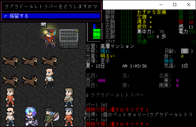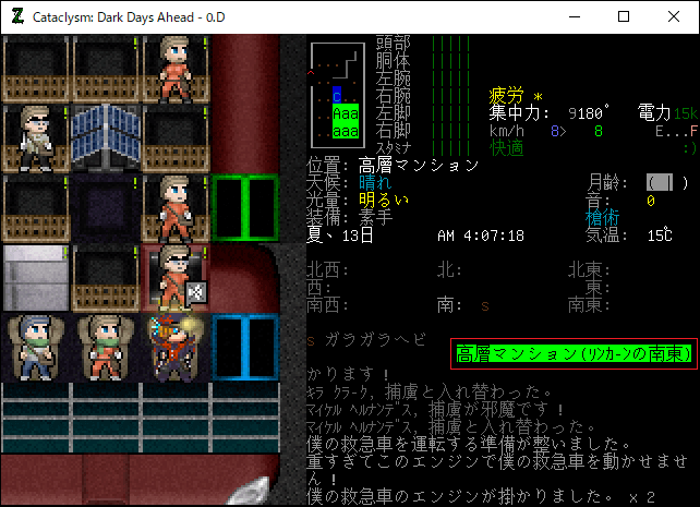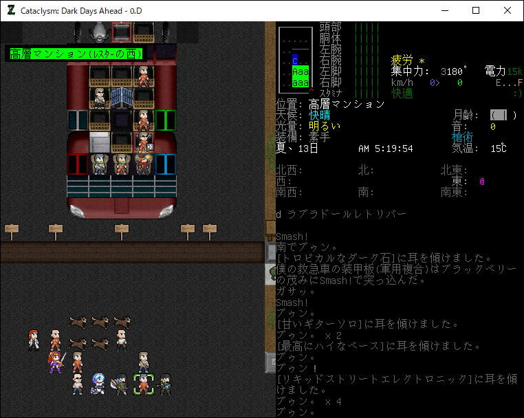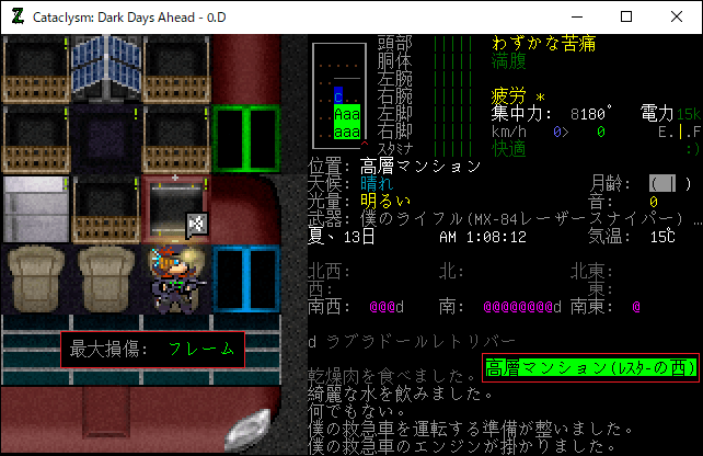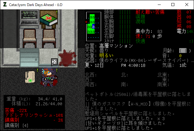 Cataclysmのプレイ日記を始めます。高層マンションの屋上を制圧しました。今回は高層マンション攻略の総仕上げを行います。HPは全快したのに苦痛が酷すぎて満身創痍になっている。