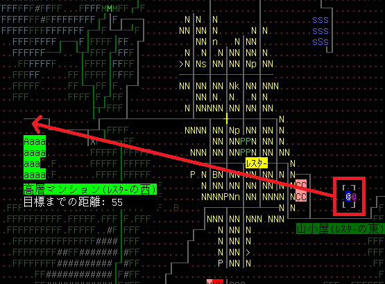 東のマンションと西のマンションの位置は上の画像。途中で山小屋に寄ってペットキャリーを回収します。まともな道路は走れないので基本的に低速の走行になってしまうな。