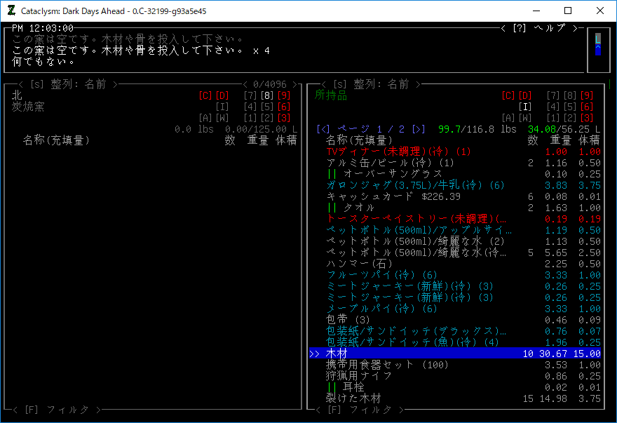 『ESC』で画面を閉じると木材が投入されました。着火するツールを持たずに『e』で炭焼窯を調べると上の画像のように中を確認できます。