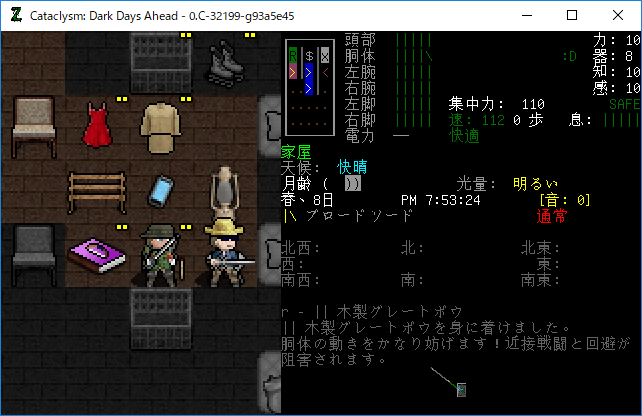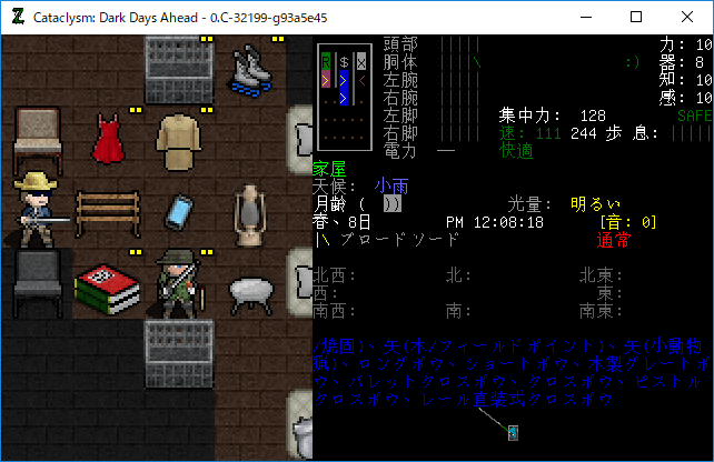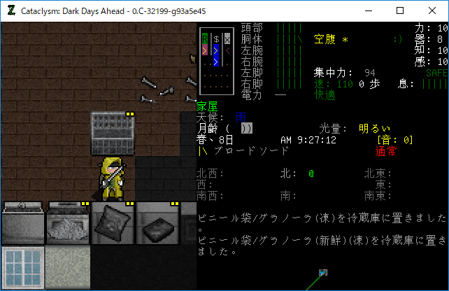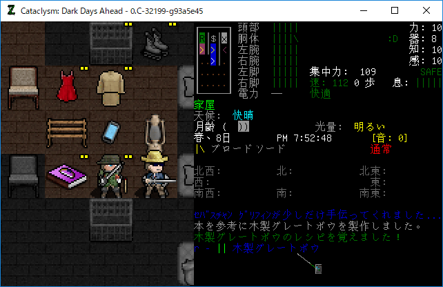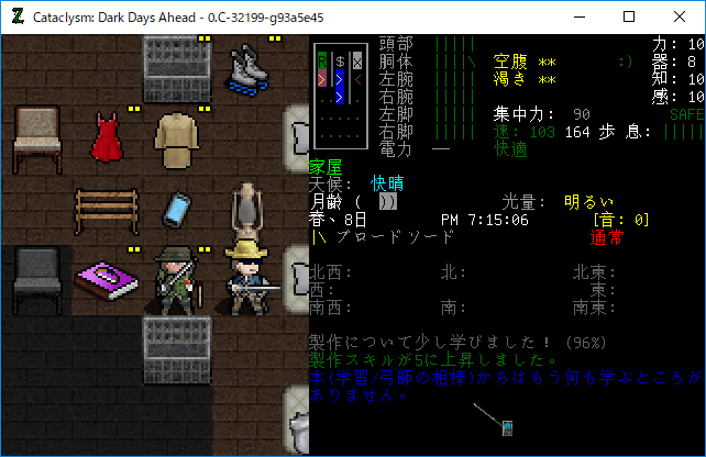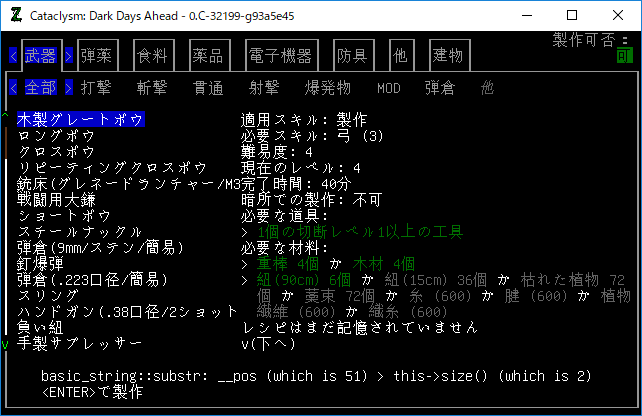 Cataclysmのプレイ日記を始めます。調理工具を手に入れて食料の調理と保存が可能になりました。今回は弓を作ろうかな。弱いゾンビが相手なら剣を振り回すだけで勝てる。だがいずれ限界を迎える気がするんだ。