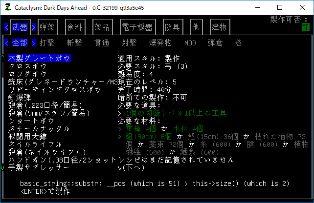 さて、ようやく弓の製作に取りかかれます。現状で一番性能の高い弓を作りましょう。威力は銃の方が高そうだけど弾丸の補充に苦労しそうだから弓のが便利そうです。