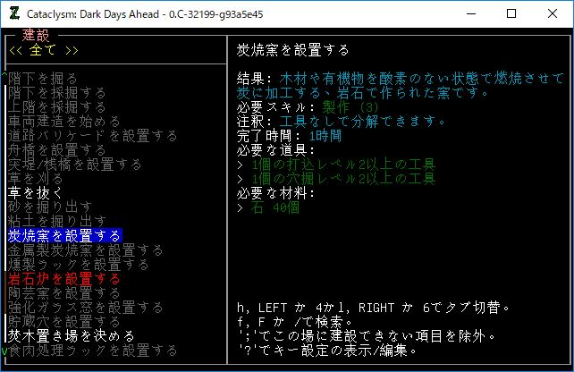 建設コマンド『*』にて野外に炭焼窯を建設します。炭焼窯をどこに設置しようか悩みました。拠点の中に作ろうか迷ったけどやめておいた(笑)。何かの間違いで火事になったら泣くに泣けない。