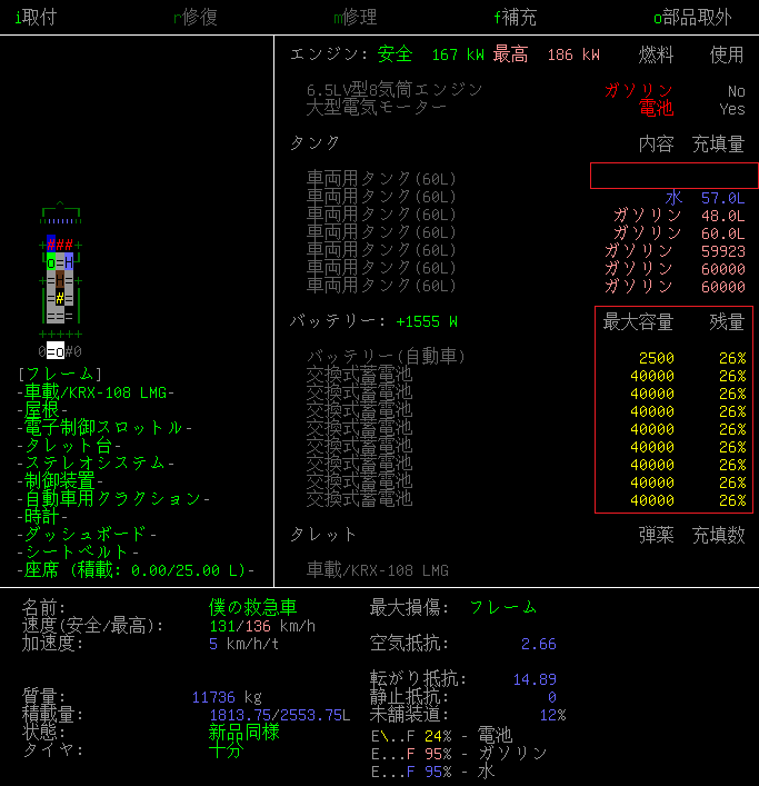 出発時の救急車は上の画像。バッテリーの残量が心配なのでガソリンエンジンもオンにしよう。空っぽになったガソリンタンクには山小屋に保管しているガソリンを入れておきます。