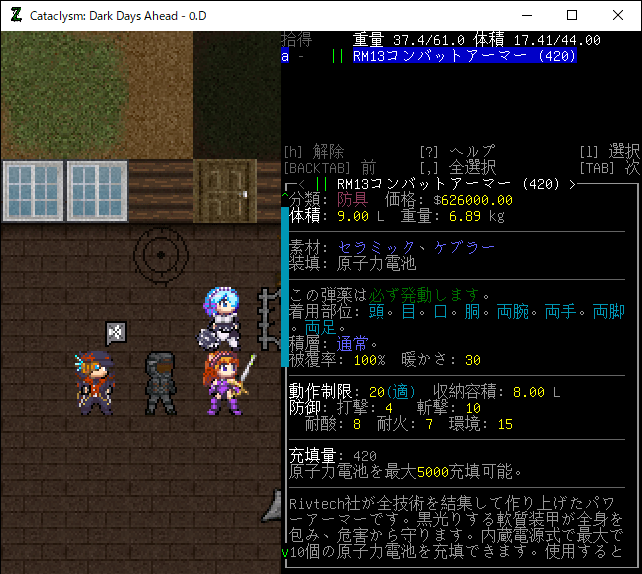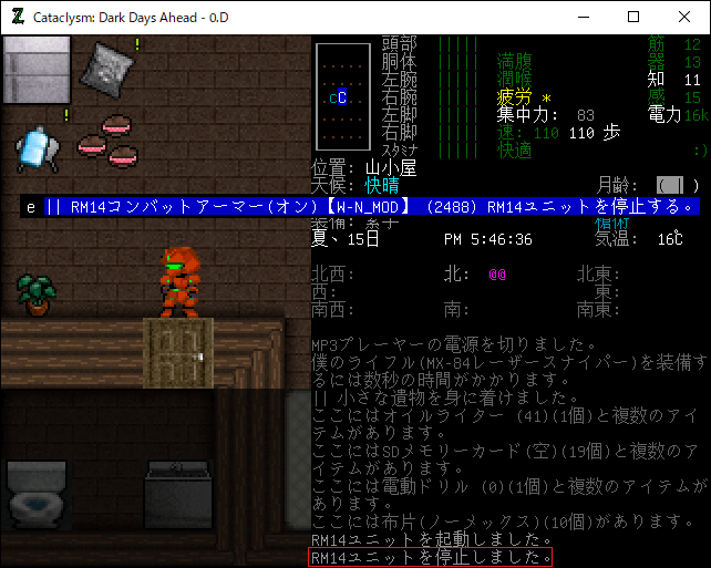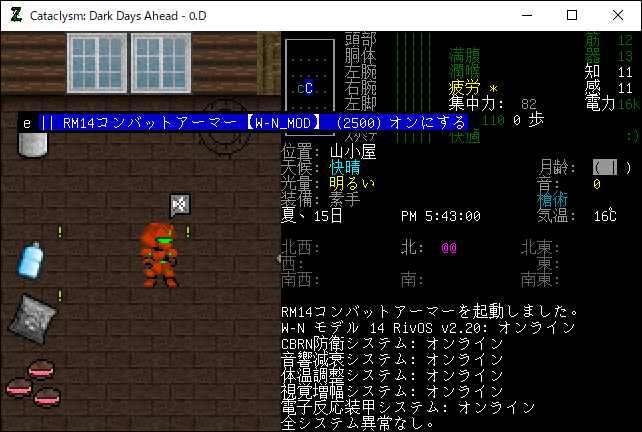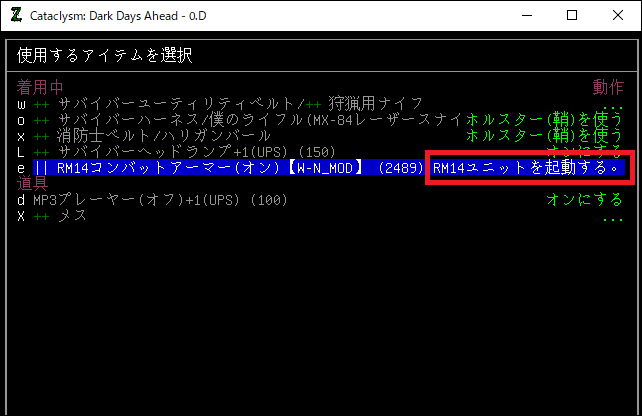RM14コンバットアーマーのjsonを完成させるのに10時間ほど掛かった。腰痛に苦しみながら休日を犠牲にした成果をとくと見てくれ!RM14コンバットアーマーを起動します!『a』コマンドでオフ状態のコンバットアーマーを使用するとオンになります。しかし、オンにした直後は何の変化もない(上の画像)。RM13と同じく1ターン経過しないと本当の意味でオン状態にはなりません。