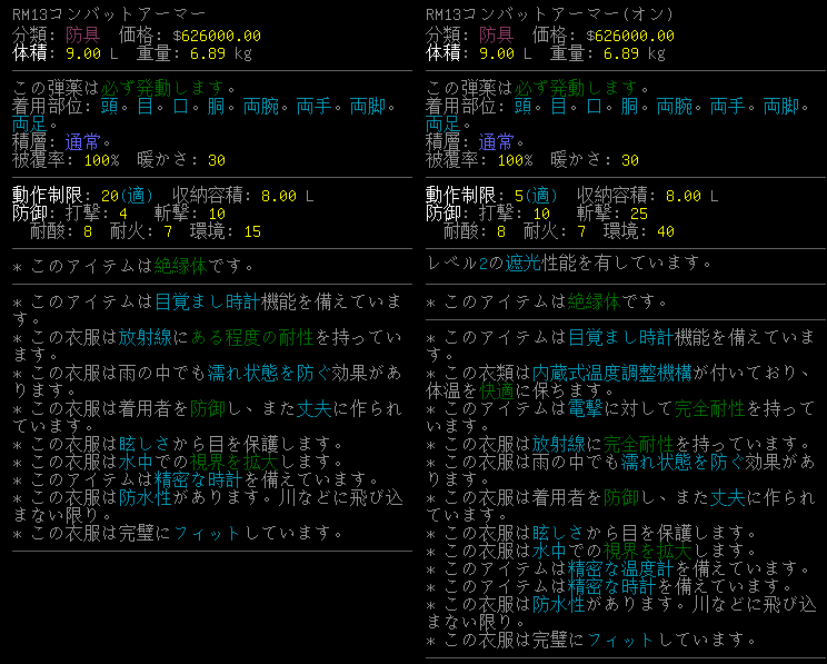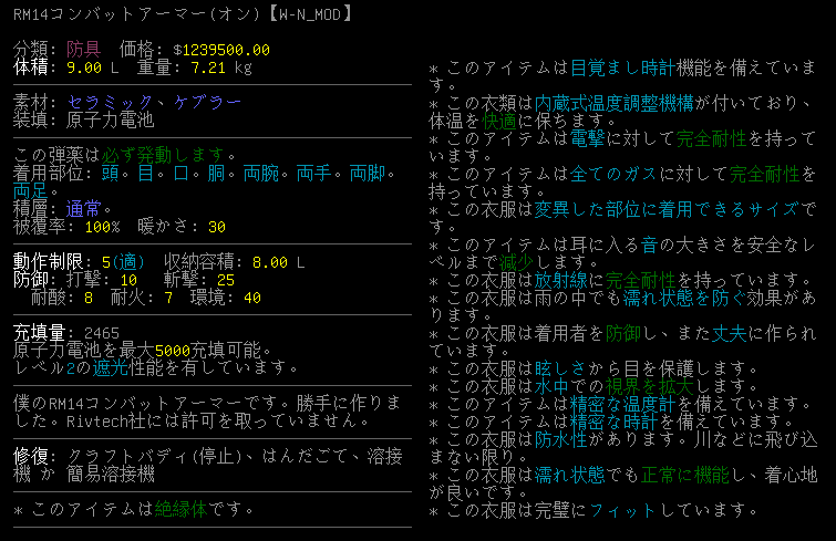 ちなみにRM14コンバットアーマーをオンにした時の性能は上の画像。このゲームに詳しい人が見れば気づくだろうけど、余計なフラグが追加されまくっている。まあしかし、無くても良いようなフラグばかりなので、それほど強化されてはいません。わざわざ書くまでもないが溶接機とケブラー平板で補強すると性能が向上するよ。