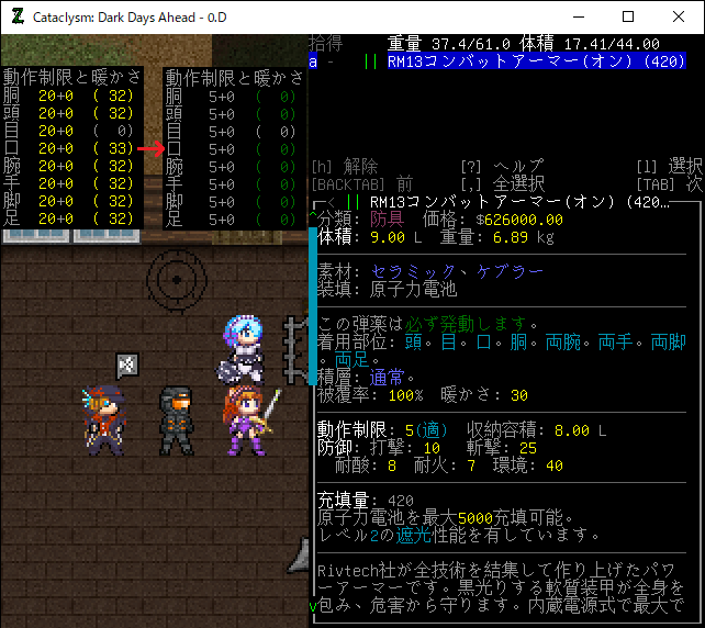 この時の能力値は上の画像。この画像から分かる変化は『感覚が4上がり』、『動作制限が20から5になり』、『暖かさが0になった』の3点だろう。この『暖かさが0になった』を実現するまでに数時間かかってしまってね。つまり『"CLIMATE_CONTROL"』フラグが仕事をしてくれなかった。どうすれば解決するのかと半泣きになりながら『"CLIMATE_CONTROL"』フラグがついている防具のjsonをコピペしまくったのだ。
