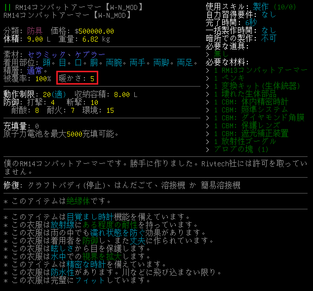 新型コンバットアーマーの名称は『RM14コンバットアーマー』にしました。そのうち開発版に実装されそうな名前だよね(笑)。上の画像はオフ状態の性能だ。RM13との違いは『暖かさ』だけです。夏用に暖かさを『30』から『5』に下げてしまった。このコンバットアーマーは夏に製作して、そのまま夏にプレイ日記が完結するので許して頂きたい。