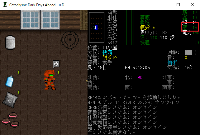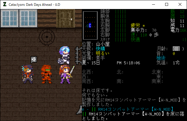 Cataclysmのプレイ日記を始めます。今回の投稿はオリジナルタイルのコンバットアーマーをクラフトします。クラフトは山小屋で行う予定だ。山小屋に帰還したら他にもやりたい作業がある。2~3日は高層マンションに戻らないので捕虜NPCとスキル上げをしておきましょう。