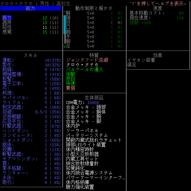 現在の能力値は上の画像。ちょっと待って、オフ状態の動作制限がヤバくない!?胴体部分が『71』なんて恥ずかしすぎる。次回は所持品と装備品の整理をします。それとタロウ・タナカ専用の『ビーム薙刀』をクラフトしようかな。