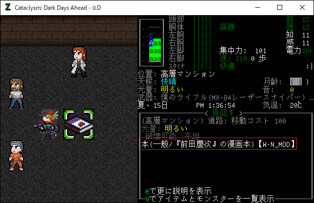 さて、訓練をする前に書物で勉強しておこうか。救急車の積荷スペースから『前田慶次の漫画本』を回収してきました。この漫画本はジャパンのサムライについて学べる名著なのだ。発売されたのは1990年代だと思われる。CataclysmDDAの世界は2040年代だから約50年前に描かれた古典的名作というわけだな。