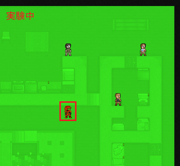 ちなみに画面を縮小すると上の様になる。緑色に光っているのが透視の範囲ですな。RM14コンバットアーマーは射撃武器を主力にしているプレイヤー用の防具になる。感覚の増加により遠距離射撃の命中率を上げて、さらに透視能力で近距離射撃の補助をしてくれるのです。過去に登場した青いスーツのRM15は近接戦闘用のコンバットアーマーにする予定だ。