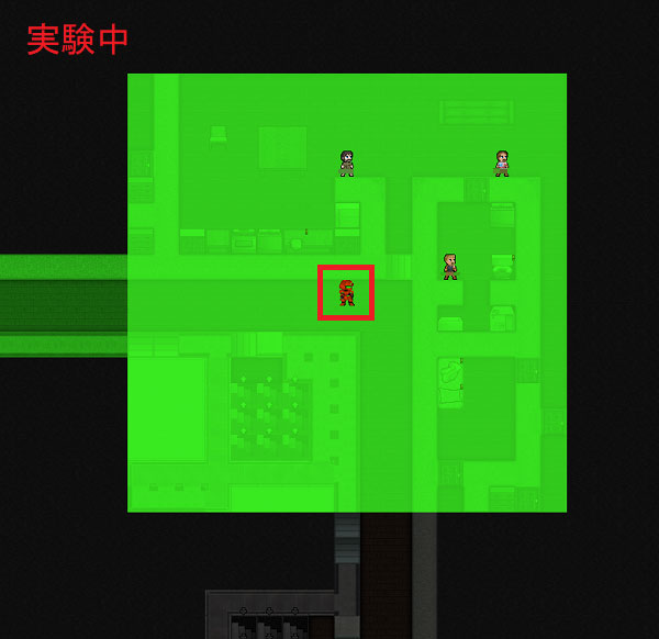 その場で待機して1ターン経過させましょう。画面が緑色になり部屋の中を透視することができました。RM14ユニットを起動すると中距離の透視効果があるのです。放射性ゴーグルのようなペナルティは無いので気軽に使う事が可能だ。