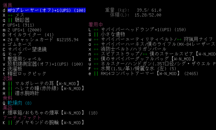 現在の所持品と装備品は上の画像。アイテムや装備の整理が中途半端なままだからゴチャゴチャしている。拾い忘れているツールもあるだろう。体力が尽きたのでアイテム整理は次回の投稿でやるね。RM14コンバットアーマーに追加しようとしたが中止した機能なども紹介したい(笑)。