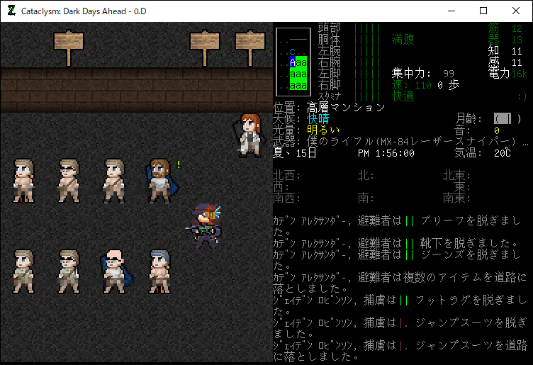 仲間を小部屋に移動させた。これで安心して『○ち○ち○』をさらけ出せるぞお。CataclysmDDAは自由度の高いゲームだからやろうと思えば何だってできます。それゆえにうっかりセクハラをしないよう心掛けているのさ。