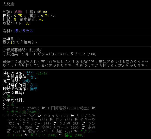 火炎瓶を15個作ったところで面倒くさくなった(総数は23個)。いちいちガラス瓶の中に入っている酒を別の容器に移し替えるのは疲れる。プレイ当時は火炎瓶の数が少ないと不安でした。よく考えてみれば『CBM:火炎放射掌』があるから火炎瓶を増やす必要は無かったな(笑)。