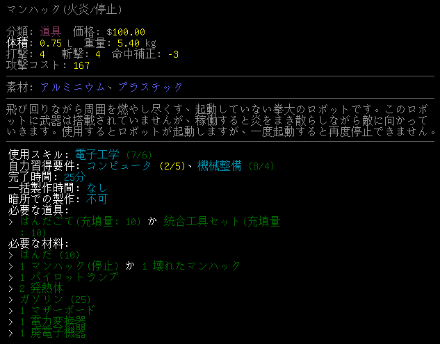 タロウ・タナカの世界はロボットのレシピが多い。生存者のバッグから手に入れたマンハックを改造してみようかな。上の『マンハック(火炎/停止)』は真菌との戦闘で活躍しそうだ。しかし、一度起動すると停止できないのはもったいない。もったいないどころか危険すぎて野放しにできないだろう。