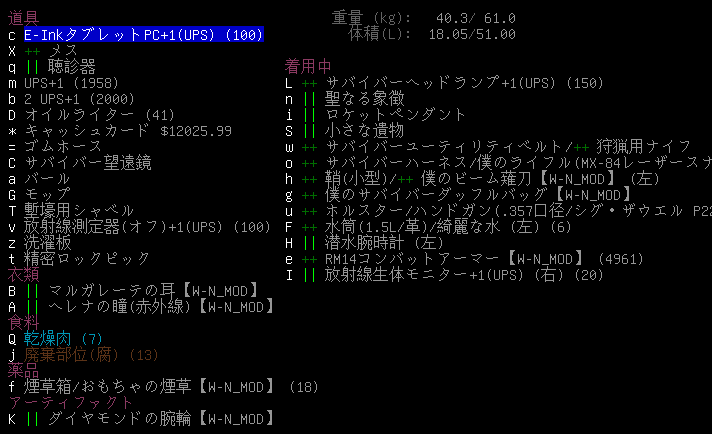 現在の所持品と装備品は上の画像。MP3プレーヤーは充電器の中に放り込んでおいた。プレイ日記が完結するまで使い続けると思っていたから驚いたよ。