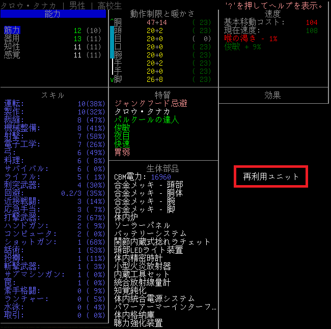 『CBM:再利用ユニット』の性能は上の画像。食事や水分補給の頻度を下げる効果があるらしい。なかなか優秀なCBMだと思われる。乾燥肉の消費が減るのは助かります。