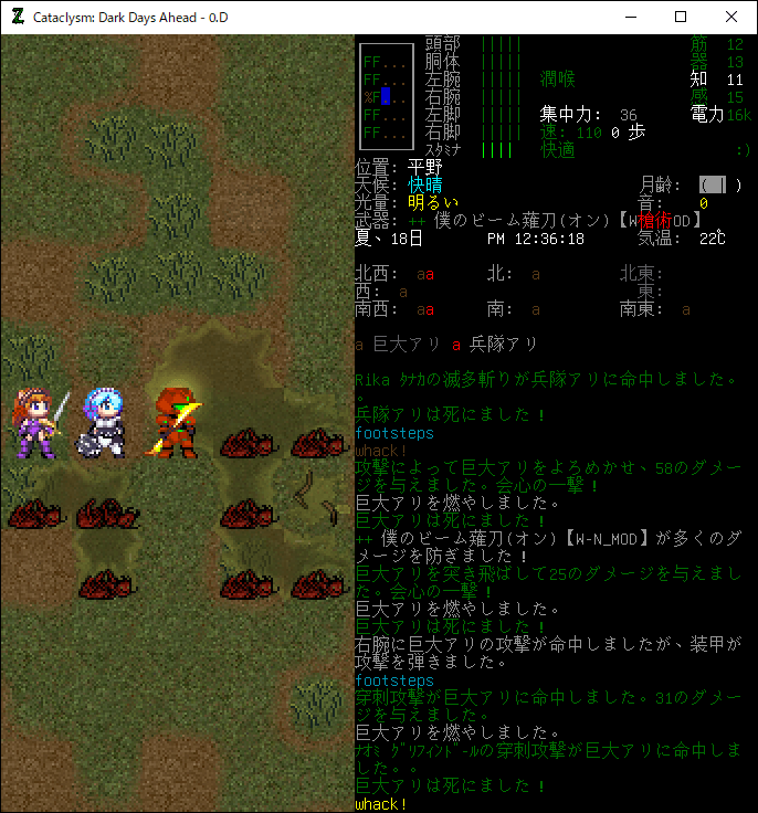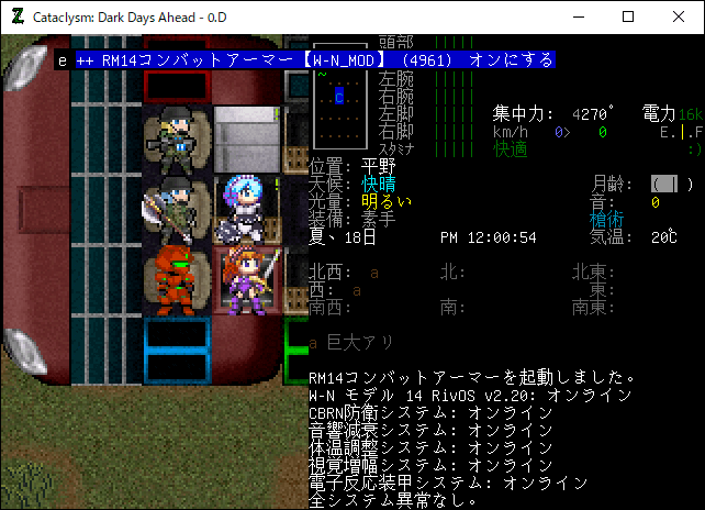 Cataclysmのプレイ日記を始めます。今回の投稿はレスターの西にあるアリ塚を攻略する予定だ。RM14コンバットアーマーがあればアリ塚ごとき余裕で踏み潰せるだろう。