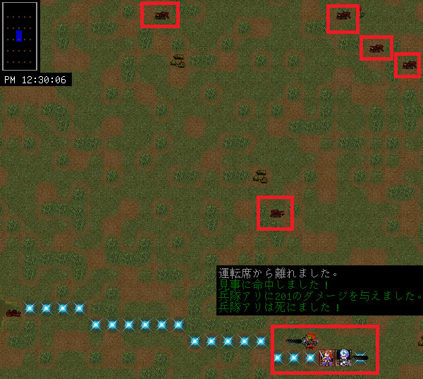 10分ほど走行してアリ塚の近くに到着しました。ここからは徒歩で森林を進むわけだが、まだまだ周辺にはアリの大群がいます。ルシファーズハンマーを破壊されたらショックなので討伐しておきましょう。
