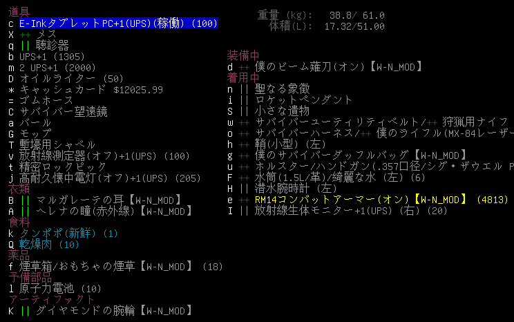 現在の所持品と装備品は上の画像。やっぱりE-InkタブレットPCで音楽を聴くとUPSの減りが早い気がする。原子力電池を持ってきたけど改良型UPSが無いから意味ねえだろ!