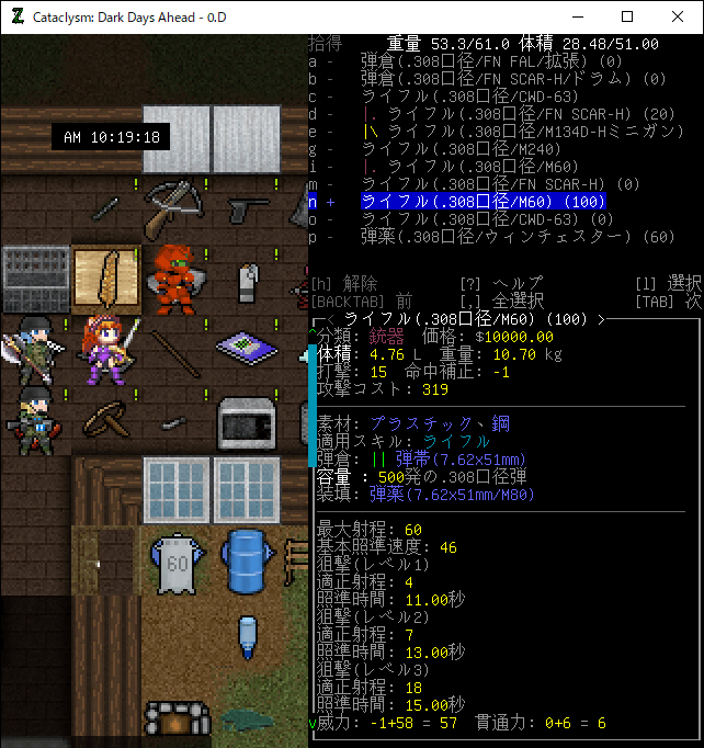 アリ塚を攻略した後は高層マンションに帰還します。門番のヒゲマッチョに銃器をプレゼントしよう。どうせなら威力の高い『.308口径ライフル』にしたいよなあ。だが.308口径の弾倉や弾薬は数が少ない(7.62×51mmも少ない)。プレゼントにしては殺傷力があり過ぎるけど『ライフル(.308口径/M60)』を持って行くことにする。