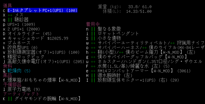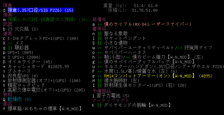 アイテム整理をした後の所持品と装備品は上の画像。30kgものアイテムを持ち歩けるようになりました。そろそろRM14コンバットアーマーに原子力電池を装填しようかな。