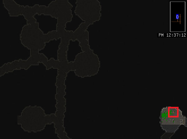 強酸アリ塚に侵入して5時間ほど経過しました。このへんで全体マップを見てみましょう。強酸アリ塚は赤いシンボルの繁殖室、白い育児室、緑の貯蔵室で構成されているようです。おそらく構造は普通のアリ塚と同じなのだろう。
