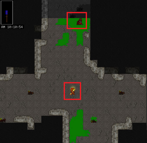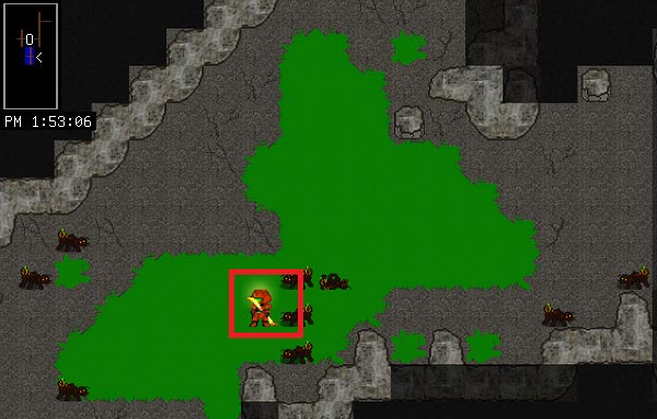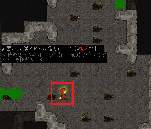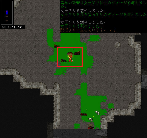 現在の戦場は上の画像。上の赤い四角の場所にいるのが女王アリですな。女王アリは卵を産み落として孵化させる能力があります。モタモタしているとアリの数が増えて面倒くさいことになるのだ。