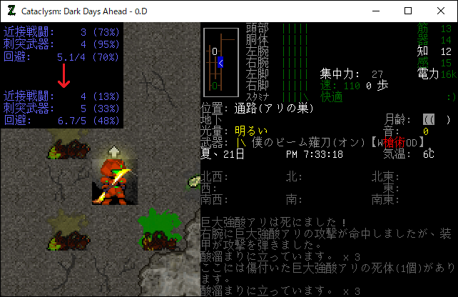 現在の能力値は上の画像。強酸アリとの戦闘で近接戦闘のスキルが向上したようです。近接戦闘する機会なんてもう無いだろうけどさ。常にレーザースナイパーを装備していないと怖いしね。