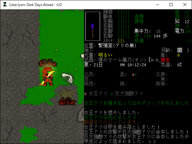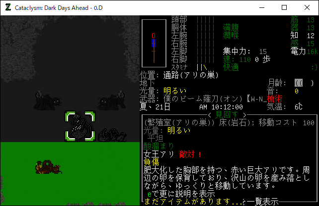 Cataclysmのプレイ日記を始めます。高層マンションの北にある強酸アリ塚にやって来ました。このアリ塚に生息する女王アリを討伐すれば強酸アリの増殖は止まるだろう。女王アリを倒さなければ地上の強酸アリがドンドン増え続けてしまうのだ。