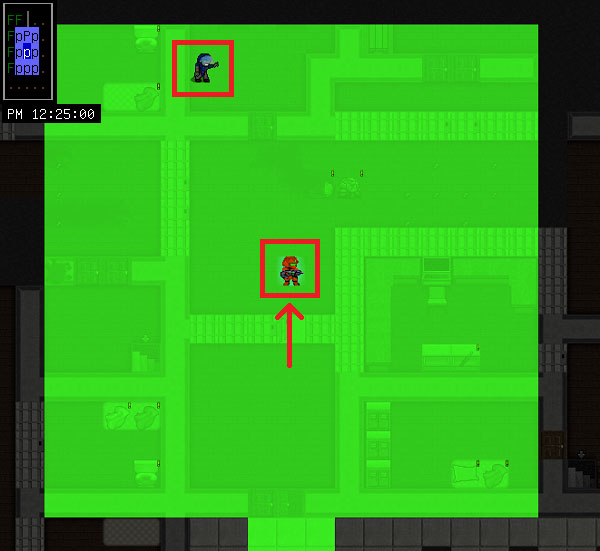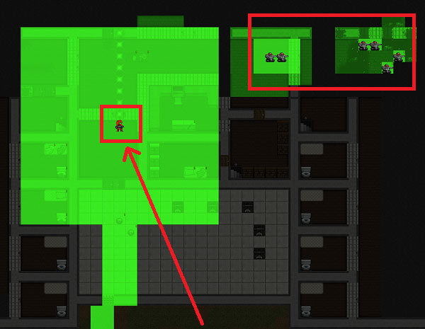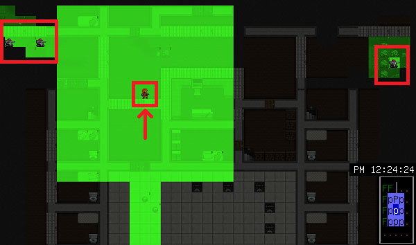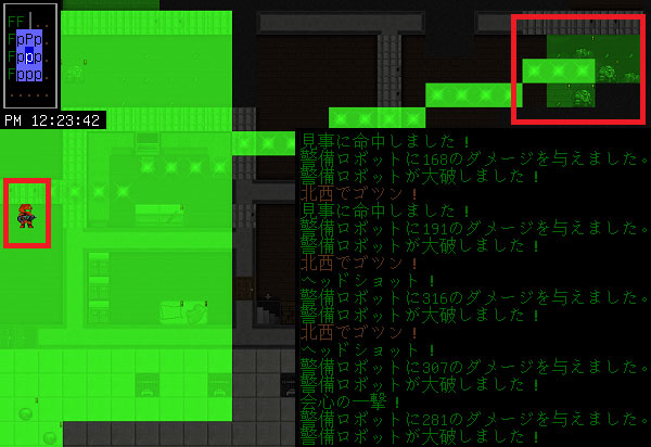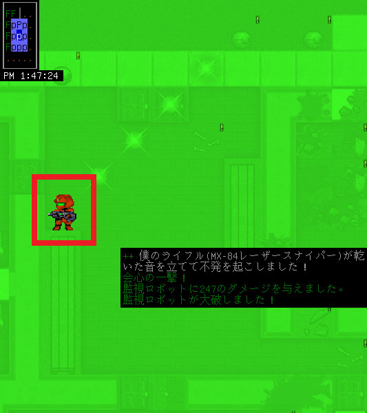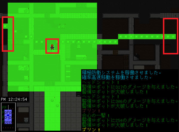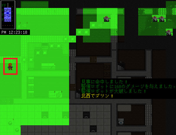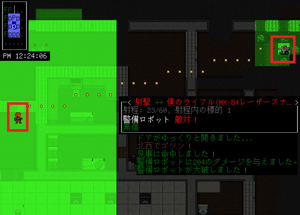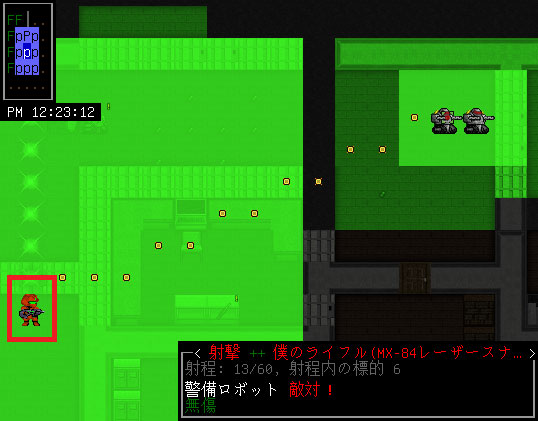 北東に現れた警備ロボットを軽く撃破しておきました。距離は23タイル離れているので、あちらから射撃は届かないだろう。スイングドアはレーザーの障害にはならないけど、9mm弾薬などの実弾は遮ると思う(たぶん)。