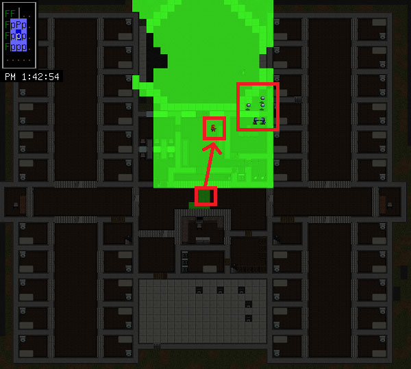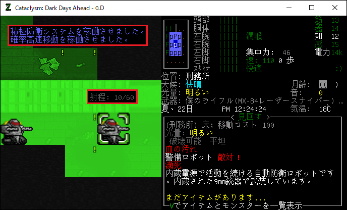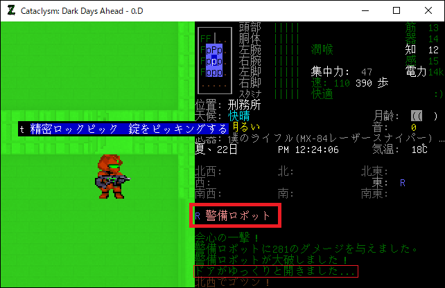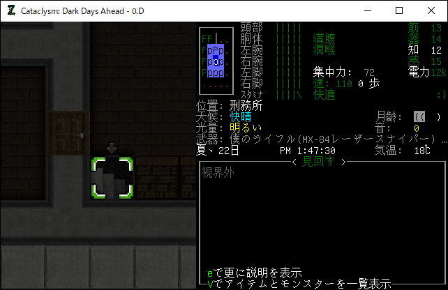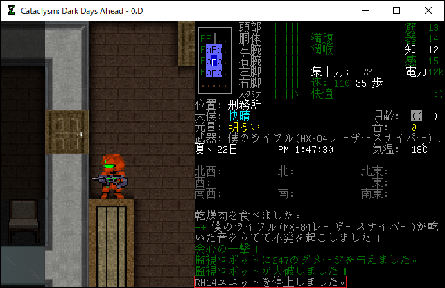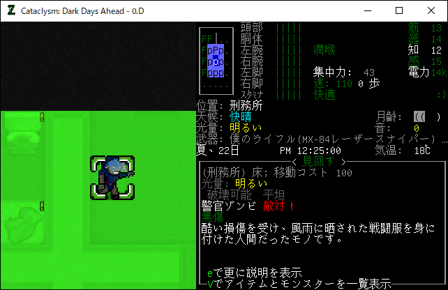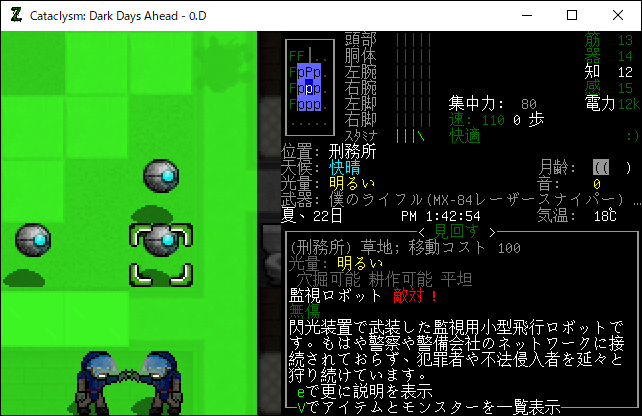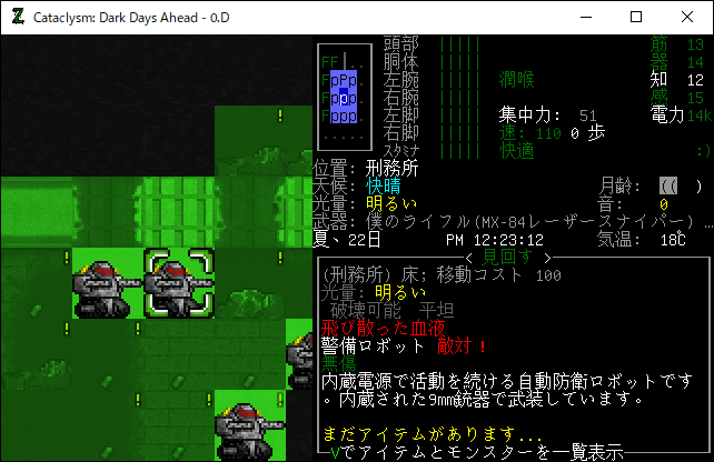 Cataclysmのプレイ日記を始めます。プリマスの北西にある刑務所に攻め込みました。ゾンビの大群と戦う準備をしてきたのに警備ロボットに遭遇してしまった。