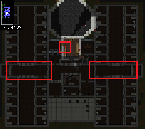この時の戦場は上の画像。警備ロボットが配置されていたのは刑務所中央の東西にある赤い四角の場所だけだった。スイングドアが普通の壁なら、いきなり警備ロボットの集団に襲撃される構造になっている。さすがにそこまで凶悪な難易度にはしなかったというわけだな(笑)。