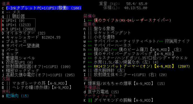 現在の所持品と装備品は上の画像。1階の敵が少なかったのでUPS電力と原子力電池は豊富に残っています。地下何階まであるのか知らないけど、まあUPS電力は心配しなくても大丈夫でしょう。