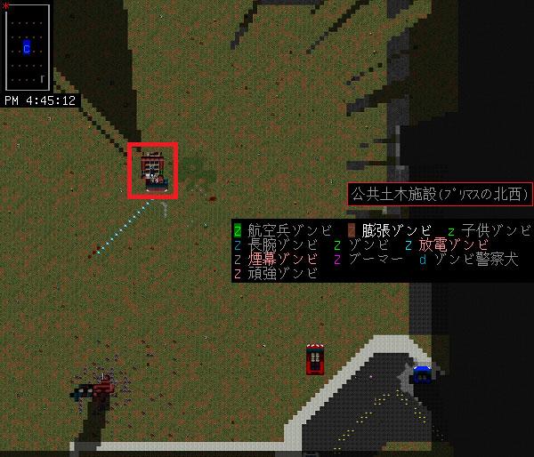 刑務所から山小屋に帰還する経路は上の画像。まだ時刻は夕方なので帰路の途中にある公共土木施設に寄っていきます。公共土木施設にはCBMを内蔵しているゾンビがいたはずだ。