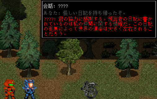 まあ待たされるよりも早く連絡がつく方が喜ばしいことだ。お前が欲しがっていた日記を回収してきたから感謝しなさい。青い戦闘スーツのNPCに依頼の達成を報告したら変なことを喋り始めました。どうやら日記には奴の仲間の情報が書かれているらしい。そして日記の有無が世界の運命を大きく左右するんだってさ。おいおい、ふざけたことを言ってるんじゃねえぞ?まるでお前らが世界の重要人物みたいな話じゃないか。主人公は僕ちゃんなんだから勝手に妄言をほざかないでほしいね。