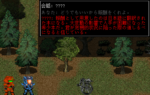 青い戦闘スーツのNPCは誇大妄想に取り憑かれているんでしょう。どうでもいいけど約束の報酬がほしいんだけどね。たしかお前はビームサーベルを持っていたから、そいつを頂いても良い(プレイ日記417)。だが、奴の用意した報酬は日本語に翻訳された希少本です。そういえば『弟の夫』を再読したいと思っていたので持っているならくれよお。