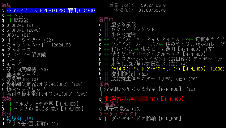 今回のプレイ日記はここで終わりにします。現在の所持品と装備品は上の画像。まあ消費したのはUPS電力くらいなので満足しておいてやるか。南に遠征する前のお遊びとしては調度良かった。