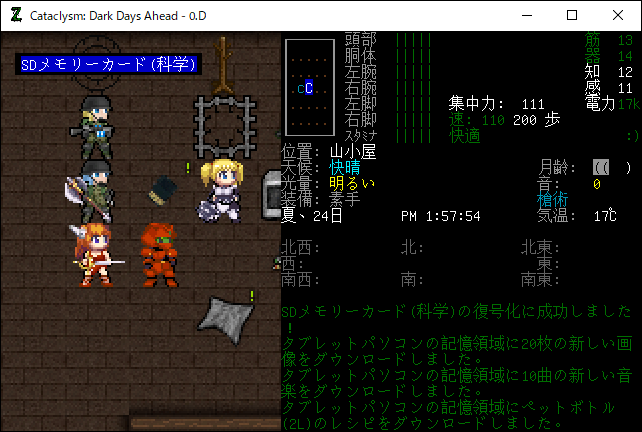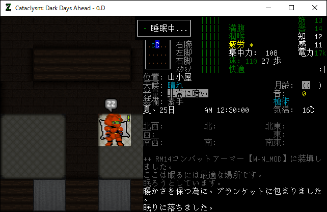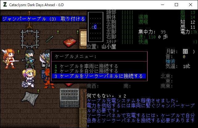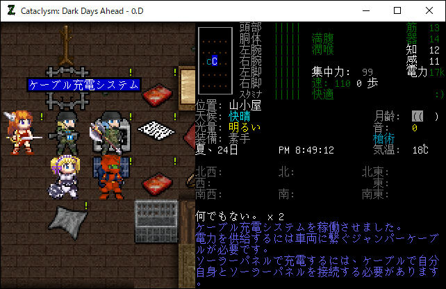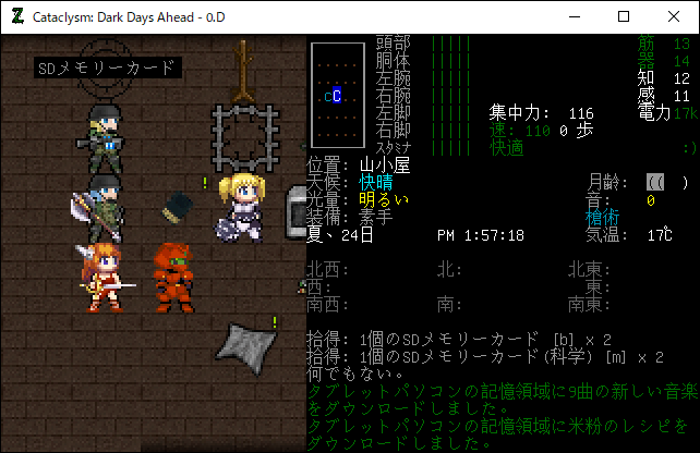 Cataclysmのプレイ日記を始めます。今回の投稿で遠征の準備を終わらせよう。遠征中に足りないものがあれば山小屋に戻れば良いのです。どうせ科学研究所が見つかるまでレスターの南と山小屋を往復することになるからね。