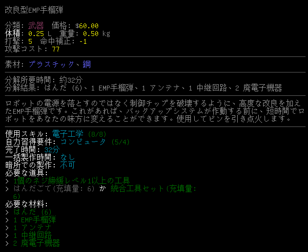 電子工学スキルが8になったので、いくつかアイテムをクラフトします。まずは『改良型EMP手榴弾』を作ろう。改良型EMP手榴弾はロボットの制御チップを破壊して味方にする効果があります。材料のEMP手榴弾は盗賊のアジトで手に入れておいた。