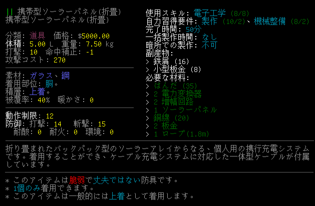 携帯型ソーラーパネルはCBM電力を回復させる効果のある電子機器です。電子機器だが防具のように着用して利用するのだ。『CBM:ケーブル充電システム』を移植したおかげで使用可能になりました。