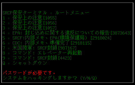 エレベーターの操作は無理だが、コンピューターに保存されている情報は全て閲覧できたよ。難しい文章ばかり表示されて俺には理解不能だったけどさ。1度もハッキングに失敗しなかったのは幸運だったと思われる。