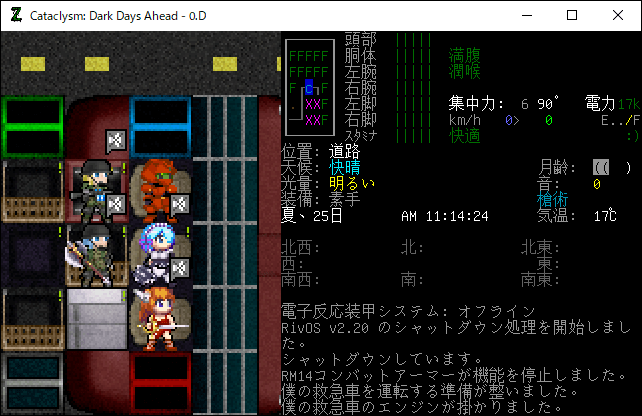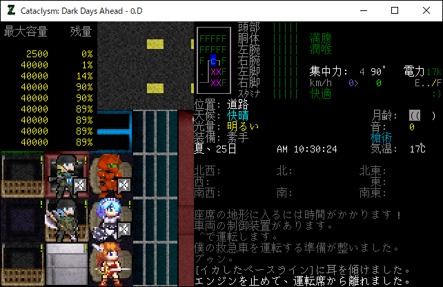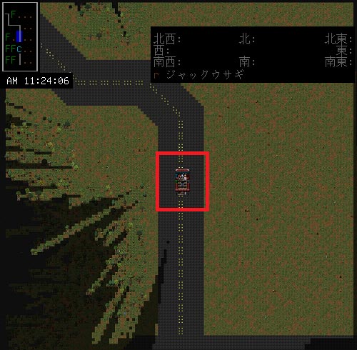 Cataclysmのプレイ日記を始めます。レスター南の遠征を開始しました。まだ道路を少し走行しただけだけどね。前回の投稿はミスにより戦車砲を発射してしまった。