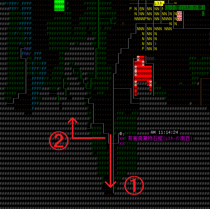 現在地から移動するには2つの進路があります。①のようにひたすら南に進むか、②のように西へ寄り道をするのか選ぶ必要があるのだ。まあ常識的に考えて西へ行くべきでしょう。西へ道路が続いているということは、その先に施設があるということだからな。そいつを放置して南へ進むのはありえない。